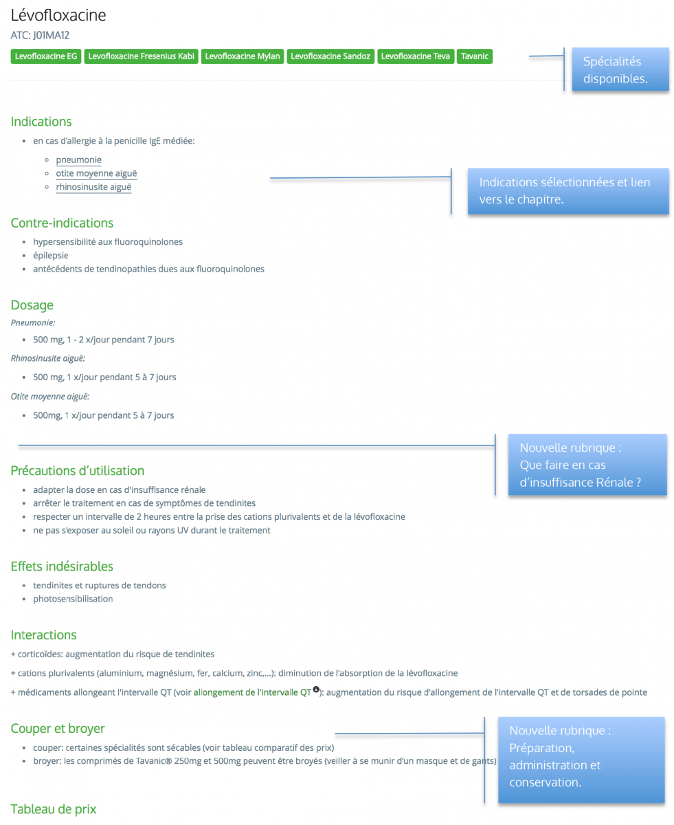 Par ailleurs, nous allons rédiger sous peu des fiches pour les produits 'à prendre en considération' en plus des médicaments « sélectionnés ». Les fiches seront en outre complétées par deux nouvelles rubriques : "Que faire en cas d'insuffisance rénale ?" et "Préparation, conservation et administration".